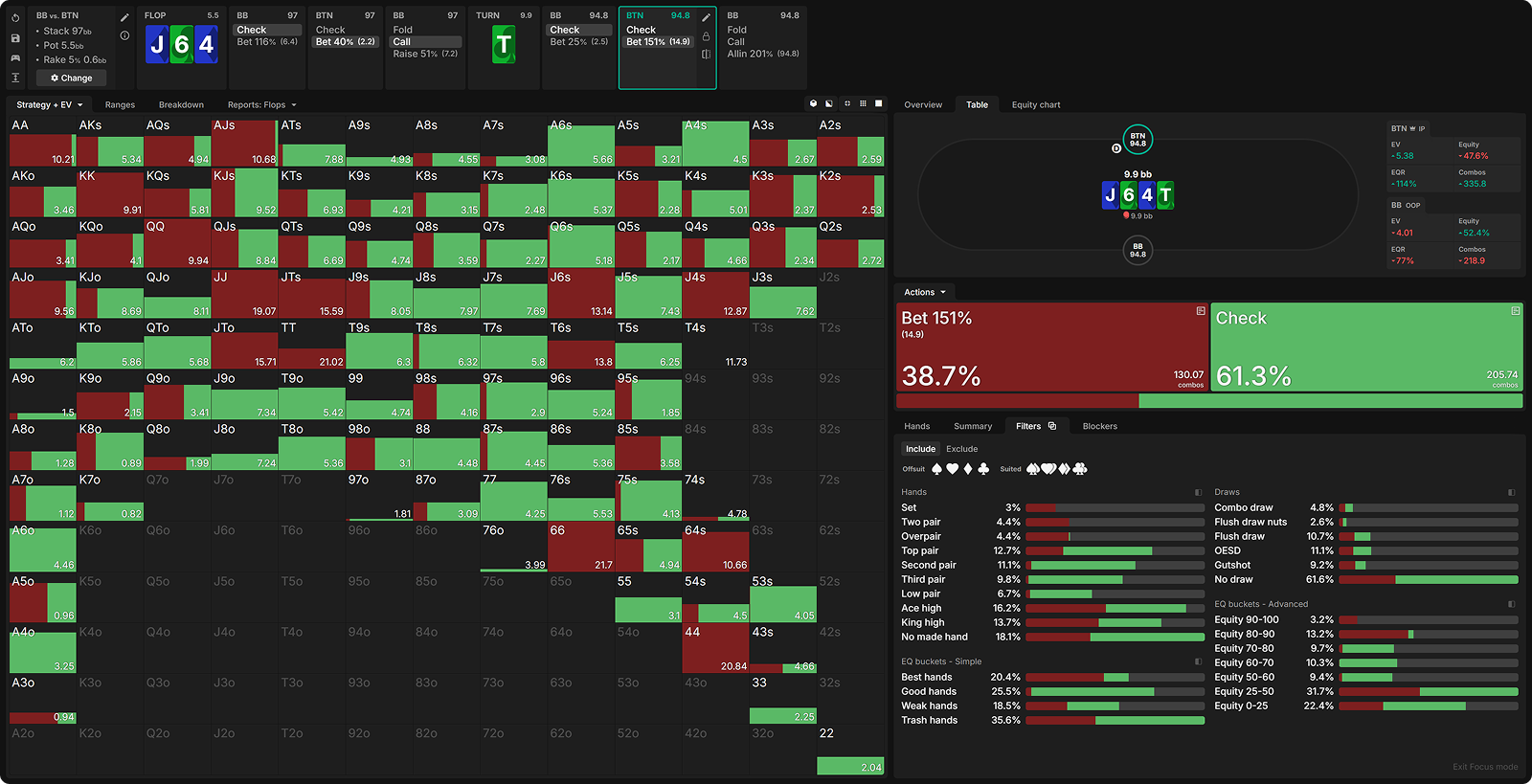 - Using an even larger overbet – Very large overbets are typically tied to a strong nut advantage, something BB doesn’t have in this spot. The BTN has a decent number of hands like 64s that may check back the turn, as well as rivered two pairs, and even hands like 77. This diminishes BB’s relative nut advantage.